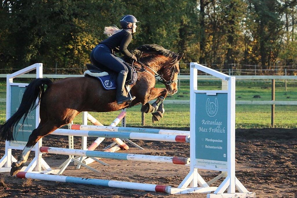 Unsere Anlage bietet Dir eine Reithalle sowie einen Longierzirkel, Außen-Reitplätze für Dressur und Springen mit Flutlichtanlage und eine Führanlage.